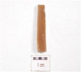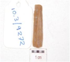 | Description / विवरण | A chert blade, trapezoidal cross-section, prepared platform, bulb absent and use-wear marks along the cutting edges. |