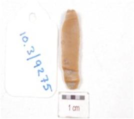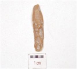 | Description / विवरण | A chert blade, trapezoidal cross-section, prepared platform, prominent bulb and ripple marks on ventral side and use-wear marks along the cutting edges. |