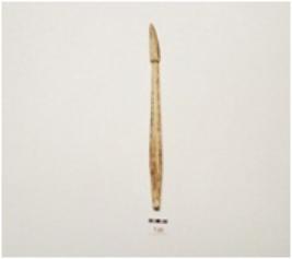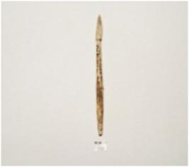 | Description / विवरण | A arrow head made on bone with tanged, polished surface, pointed one end, circular other end and irregular circular cross section. |