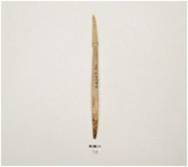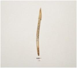 | Description / विवरण | A carved arrow head made on bone with tanged, pointed one end, polished surface, circular other end and plano convex cross section. |