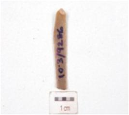 | Description / विवरण | Fragment of a parallel sided blade, made on chert broken along proximal end, intact distal end, double ridge on dorsal side and use-wear marks on working edges. |