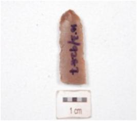 | Description / विवरण | Fragment of a parallel sided blade, made on chert, prepared platform on proximal end, broken along distal end, diffused bulb on ventral, double ridge on dorsal side and use-wear marks along cutting edges. |