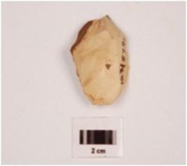 | Description / विवरण | A scraper made on chert with flake scars on the surface, prepared platform and a diffused bulb on ventral side retouch along the cutting edges. |