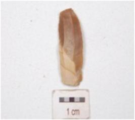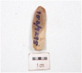 | Description / विवरण | Fragment of a parallel sided blade, made on chert, prepared platform on proximal end, diffused bulb on ventral side, blade scars on dorsal side, use-wear marks along cutting edges and broken along distal end. |
