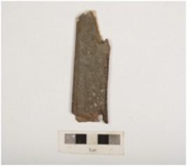 | Description / विवरण | A basalt stone harvester with two perforation, which one is broken, smooth surface with one working edge, grayish in colour slightly damaged. |