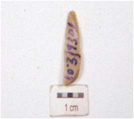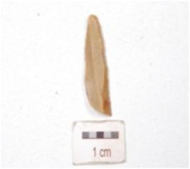 | Description / विवरण | Fragment of a parallel sided blade, made on chert, intact distal end, broken proximal end, blade scars on dorsal side and use-wear marks along cutting edges. |