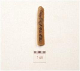 | Description / विवरण | A parallel sided chert blade with double ridge on dorsal, trapezoidal cross section, bulb on ventral, striking platform, use wear marks on cutting edge and broken along distal end. |