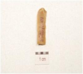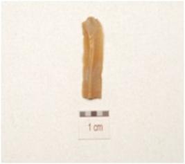 | Description / विवरण | A parallel sided chert blade with double ridge on dorsal, trapezoidal cross section, bulb on ventral, striking platform, use wear marks on cutting edge and broken along distal end. |