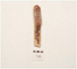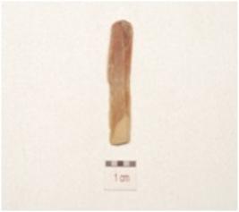 | Description / विवरण | A parallel sided chert blade with double ridge on dorsal, bulb on ventral, prepared platform, trapezoidal cross section, use wear marks on cutting edge and broken along distal end. |