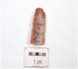 | Description / विवरण | Blade with a striking platform on one end, positive bulb on ventral side blade scars on surface, use wear marks on both working edge and broken at distal end. |