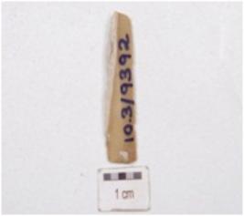 | Description / विवरण | A parallel sided microlithic chert blade with a mid-ridge on the dorsal side, triangular cross-section and use marks along the cutting edges. |