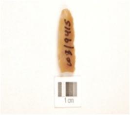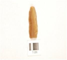 | Description / विवरण | A chert blade with double ridge on dorsal side, prepared platform, bulb on ventral, trapezoidal cross-section and use-wear marks on cutting edge. |