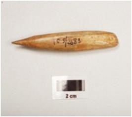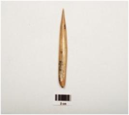 | Description / विवरण | A polished bone point with pointed end, thick and broad at other end, vertical cracks on surface, oval in section, |