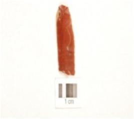 | Description / विवरण | A chert blade with prominent mid-ridge on dorsal, prepared platform, bulb on ventral, triangular cross-section and use-wear marks on cutting edge. |