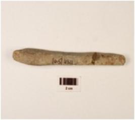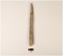 | Description / विवरण | Fragment of a stone point slightly broken at both ends, manded, rectangular cross section, smooth surface with polish, grey in colour. |
