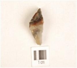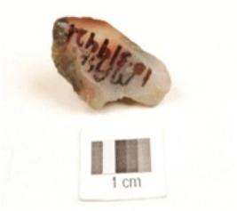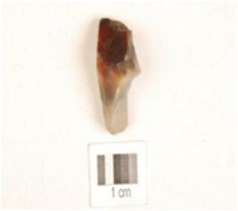 | Description / विवरण | A chalcedony utilized flake with blade scars on dorsal and use-wear marks on working edge. |