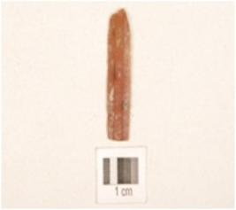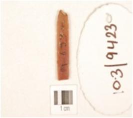 | Description / विवरण | A parallel sided chert blade with double ridge on dorsal side, trapezoidal cross-section, striking platform, diffused bulb on ventral and use-wear marks on cutting edge. |