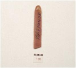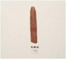| Description / विवरण | Fragment of a parallel sided blade made on chert, double ridge on dorsal side, distal end is broken, prominent bulb on ventral and use wear marks along the working edge. |