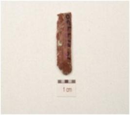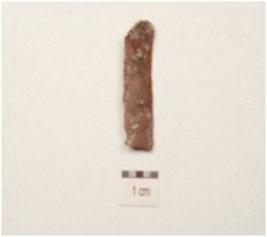 | Description / विवरण | Fragment of a parallel sided blade, double ridge on dorsal prominent bulb on ventral use wear marks along the working edge and trapezoidal cross section. |