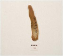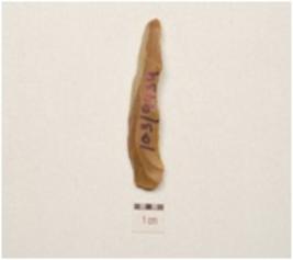 | Description / विवरण | Fragment of a parallel sided blade, blade scars on dorsal prominent bulb on ventral and use wear marks along the working edge. |