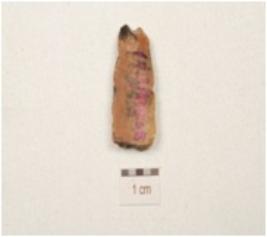 | Description / विवरण | Fragment of a parallel sided blade, made on chert, double ridge on dorsal trapezoidal cross section and use wear marks along the working edge. |