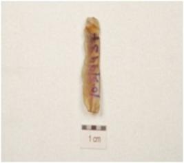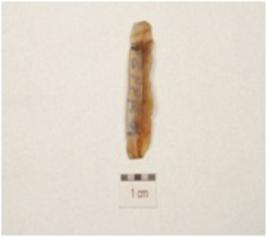 | Description / विवरण | Fragment of a parallel sided blade, made on chert, double ridge on dorsal side, trapezoidal cross section and use wear marks along the working edge. |