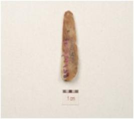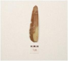 | Description / विवरण | Fragment of a parallel sided blade, made on chert, double ridge on dorsal side, trapezoidal cross section and use wear marks along the working edges. |