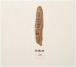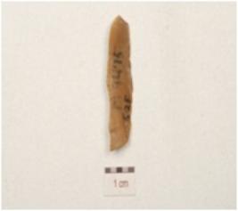 | Description / विवरण | Fragment of a parallel sided blade made on chert, single ridge on dorsal triangular cross section and use wear marks along the working edge. |