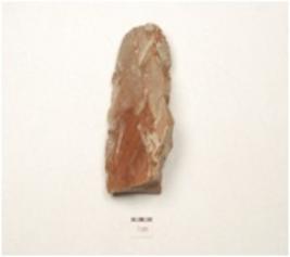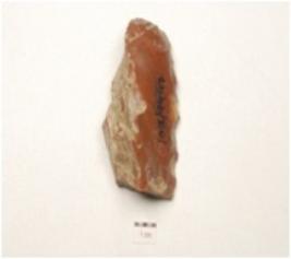 | Description / विवरण | A scraper made on chert, use wear marks along the working edge, prominent bulb on ventral side and flake scars on dorsal side. |