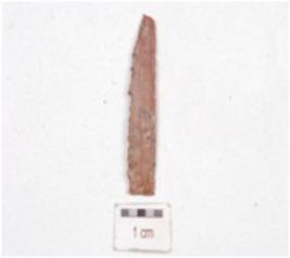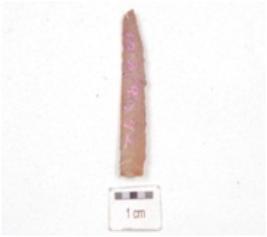 | Description / विवरण | Fragment of a parallel sided blade, made on chert, broken along proximal end, blade scars on dorsal side, retouches along one lateral edge and use-wear marks along cutting edges. |