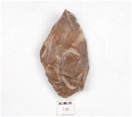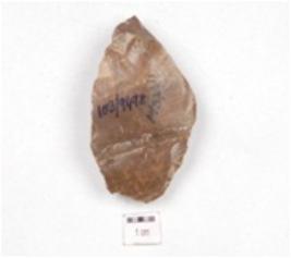 | Description / विवरण | An end struck utilized chert flake, prominent bulb on ventral side and use-wear marks along cutting edges. |