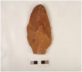 | Description / विवरण | A handaxe made on quartzite side struck flake with flake scars on both sides and irregularly retouched edges. |