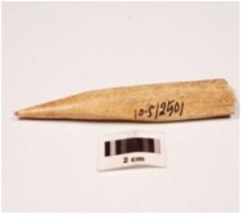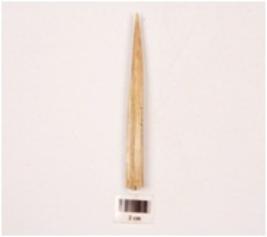 | Description / विवरण | Fragment of a bone point with triangular in section, slightly broken at one end, sharp pointed at other ned, very finely polished both sides, smooth surface. |