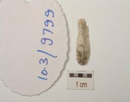 | Description / विवरण | Blade made on end struck flake, mid ridge on dorsal, bulb on ventral and use wear marks along cutting edges. |