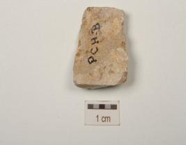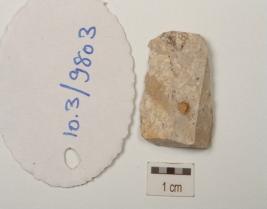 | Description / विवरण | End struck chert flake, blade scars on dorsal surface, use wear marks along cutting edges, positive bulb on ventral surface and triangular cross section. |
