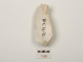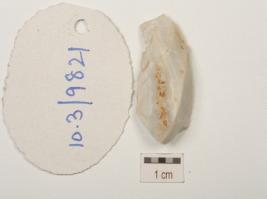 | Description / विवरण | End struck chert flake, negative bulb on ventral surface, chipping dorsal surface and use wear marks along cutting edges. |
