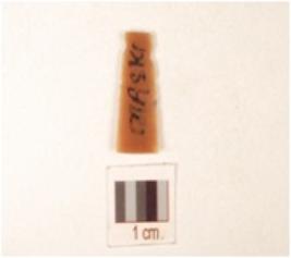 | Description / विवरण | A chert blade with triangular cross section, use-wear marks along the cutting edge and prepared platform. |