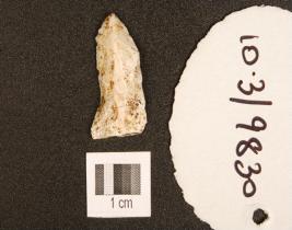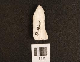 | Description / विवरण | A chert blade with prominent mid-ridge on dorsal, triangular cross-section, striking platform, bulb on ventral and use-wear marks on cutting edge. |