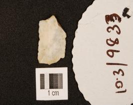 | Description / विवरण | Fragment of chert blade with prominent mid ridge on dorsal side, triangular cross-section and use wear marks on cutting edge. |
