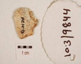 | Description / विवरण | A chert flake with flake scars on dorsal. |
