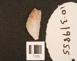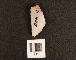 | Description / विवरण | A chert utilized flake with flake scars on dorsal and use-wear marks on right edge. |