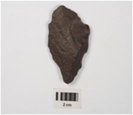 | Description / विवरण | A scraper made of basalt with prepared platform, diffused bulb on ventral, flake scars on dorsal and irregular retouches on cutting edges and distal end. |