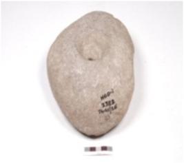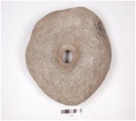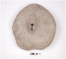 | Description / विवरण | Mace made of quartzite, uneven in shape, rough surface with perforation. |