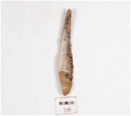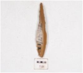 | Description / विवरण | A knife shaped blade, made with chert, mid-ridge on dorsal surface, irregular edges and prominent bulb on ventral surface. |