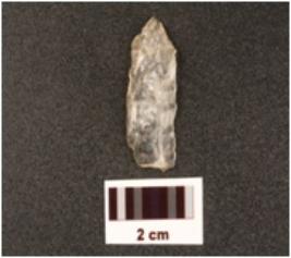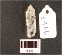 | Description / विवरण | A parallel sided mesolithic crystal blade with pointed distal end, a mid-ridge with flake scars on surface, proximal end broken, diffused bulb on ventral surface. |