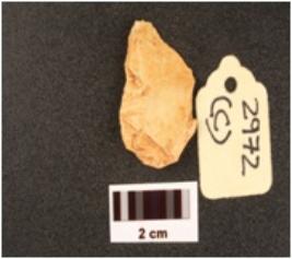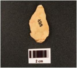 | Description / विवरण | Flake made on chert with use-wear marks along cutting edges, prepared platform, with prominent bulb on ventral side, smooth surface. |