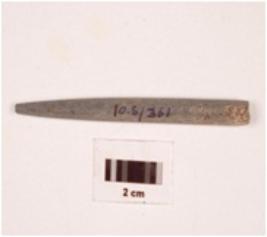 | Description / विवरण | Fragment of pointed arrow head stone, circular in section, greyish colour, smooth surface. |