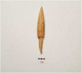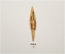 | Description / विवरण | A arrow head made on bone with tanged, polished surface, pointed one end, other end is tanged though pointed and irregular circular cross section. |