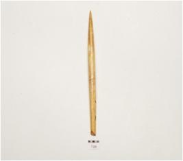 | Description / विवरण | A point made on bone, polished surface, pointed one end, broken other end and circular cross section. |