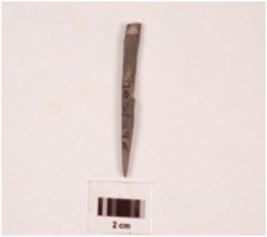 | Description / विवरण | Fragment of pointed arrow head stone, rectangular in section, one end is pointed, greyish colour, smooth surface. |